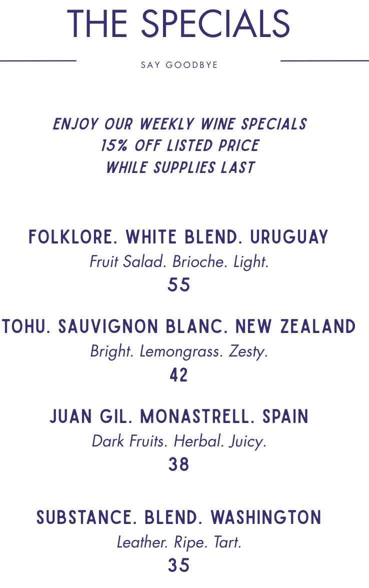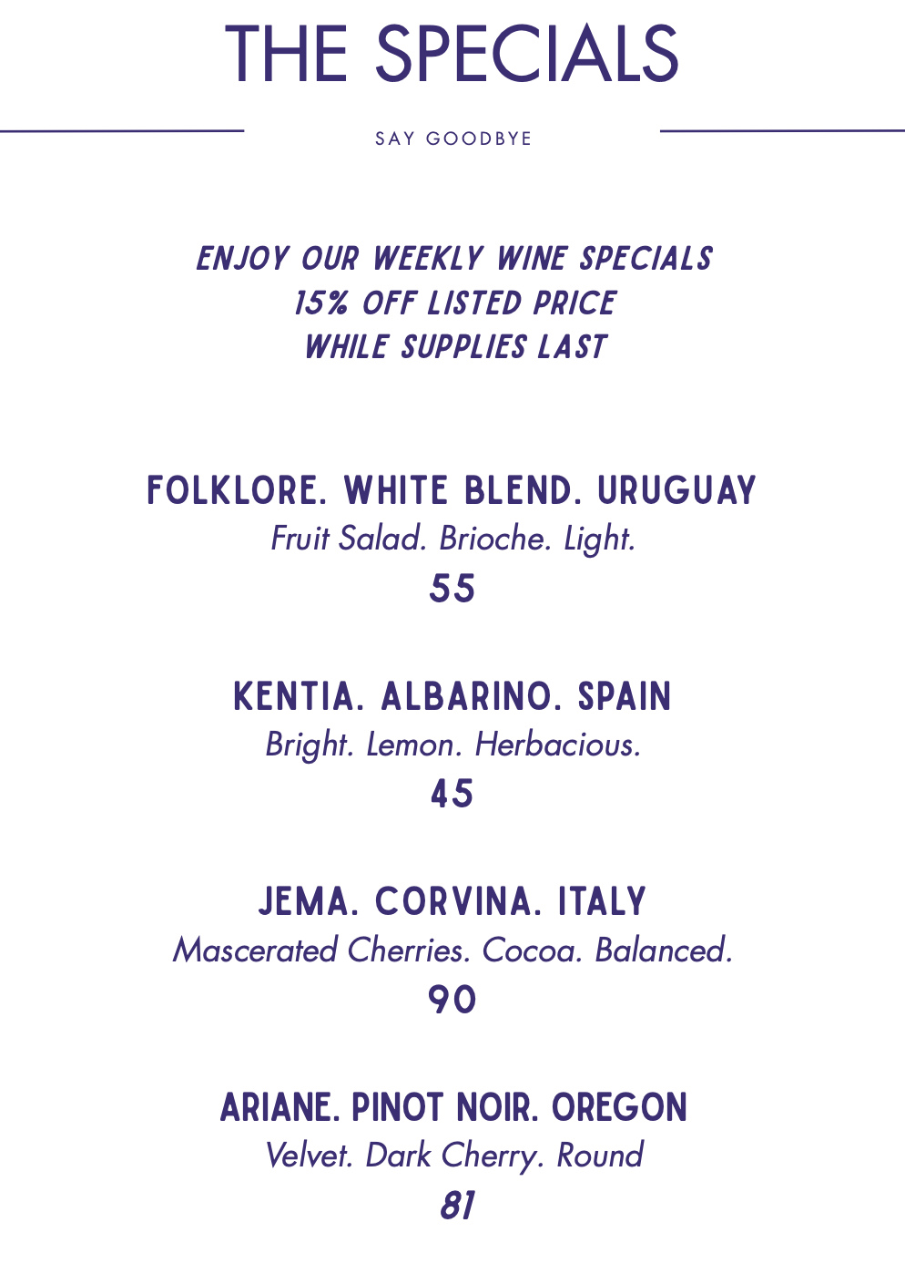The perfect compliment to the perfect wine, delivering new dimensions and enhancing the natural flavors. Each of our menu items, have been created to compliment our wine list. Each menu item is “small plate” and portioned for a single guest serving.