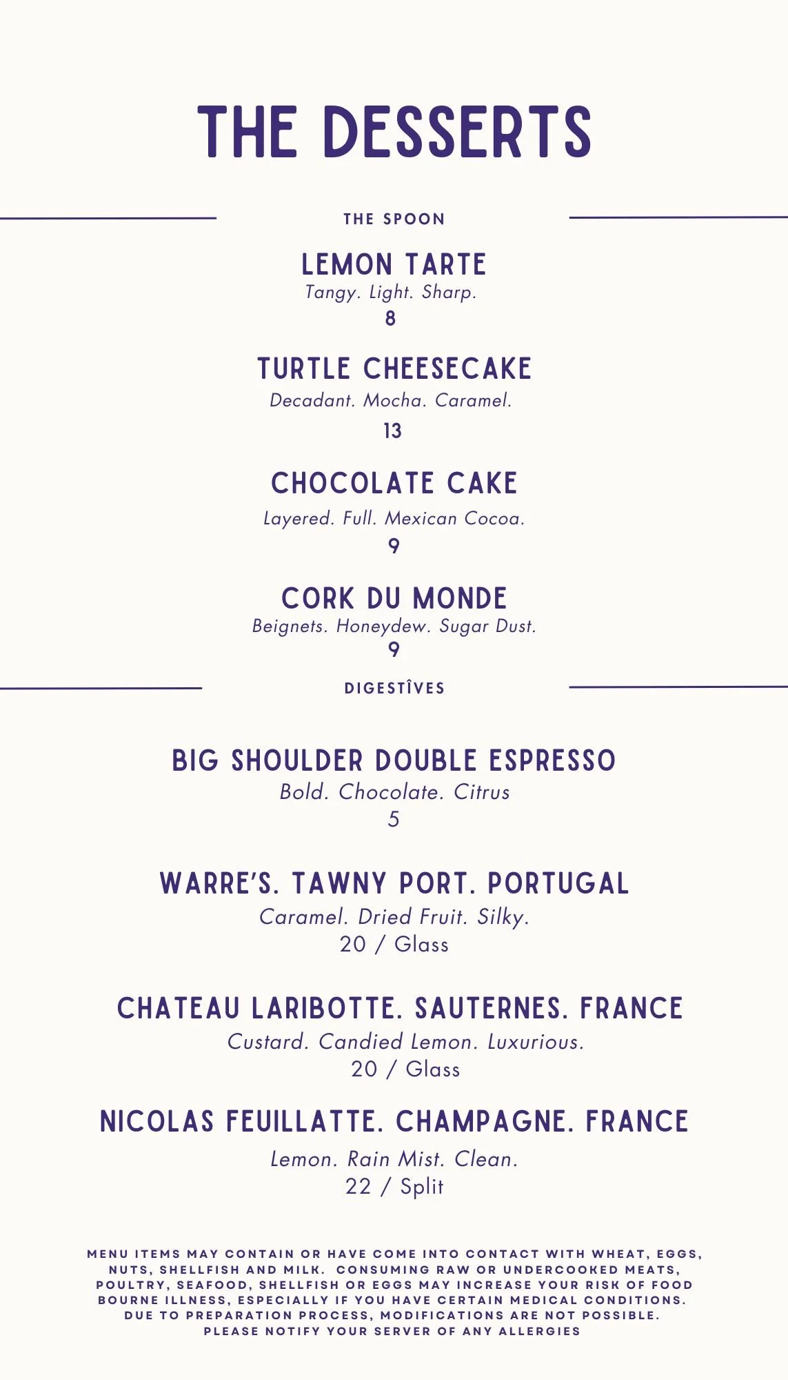 Roasted by our Chicago favorite Big Shoulders, enjoy an espresso, cappuccino or latte to accompany your sweet dessert. Try our selection of loose teas from Two Leaves & A Bud, and organic juices from Tractor Beverage.